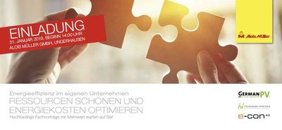 "Ressourcen schonen und Energiekosten optimieren" - zu diesem Thema lädt die Firma Alois Müller zusammen mit GermanPV am 31.01.2019 nach Ungerhausen ein, um interessierten Unternehmern neue Wege für die Zukunft aufzuweisen.